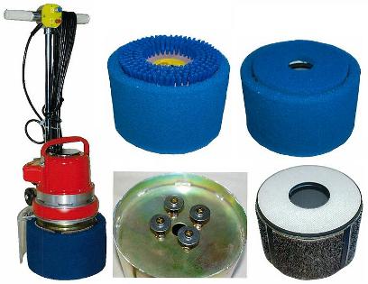 ポリッシャーにドラムをセットし、階段の床面と側面のけり込みを同時に清掃できる洗浄装置。これまでは、階段掃除は床面とけり込み部分を分けて洗浄していたが、大きな労力を伴った作業であった。 同装置はドラムの側面にパッドを張り付け底面にもブラシを取付け、階段の床面と蹴り込みを同時に洗浄できるようにした。清掃時間を短縮でき、労力も大幅に軽減できる。誤動作防止用安全スイッチ付です |