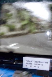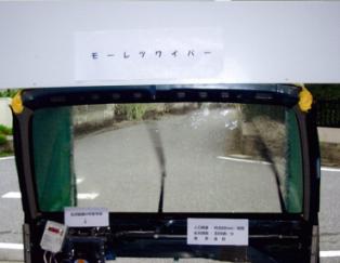 猛烈な雨でも視界が確保できるワイパ装置です。 現行の往復揺動式ワイパ装置を用い、猛烈な雨の時には、払拭範囲を半減させ払拭回数を倍増(300回/分)させます。払拭範囲の可変は、リンク機構に新たなリンクロッドを設け、このリンクロッドの支点と両端部の連結点との距離を可変します。これはスイッチ操作で可逆的に行います。百聞は一見にしかず!展示会で実演します。 |