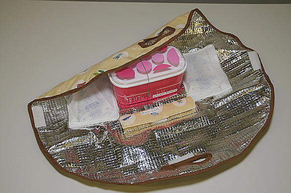 この作品は気温が高いときにお弁当を腐らせないように作ったものです。お弁当を包むことで、保冷剤と弁当箱がくっつき、さらに保冷効果も高まります。