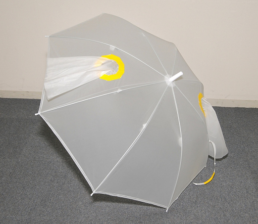 傘には2ヶ所穴を開けて風を通すようにして、穴の周りにはビニールをつけて、外から雨が入らないようにしました。